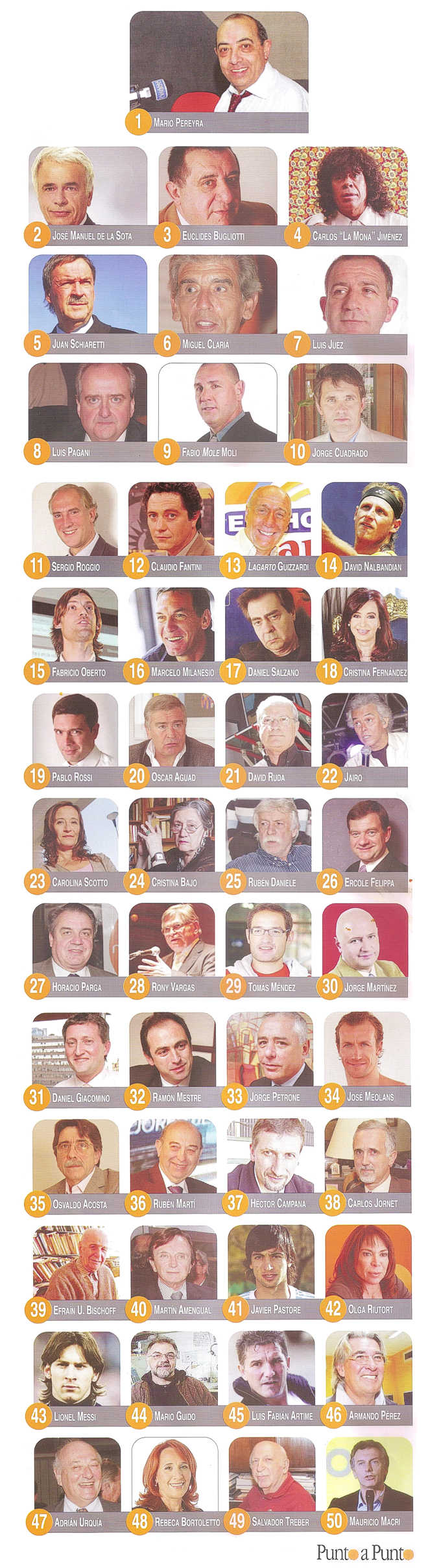 El “top 50” agrupa a las personas, instituciones y empresas más influyentes de la provincia de Córdoba, e integra un trabajo realizado por la consultora GDA para “Punto a Punto” que incluye a políticos, empresarios, deportistas, artistas e intelectuales.
